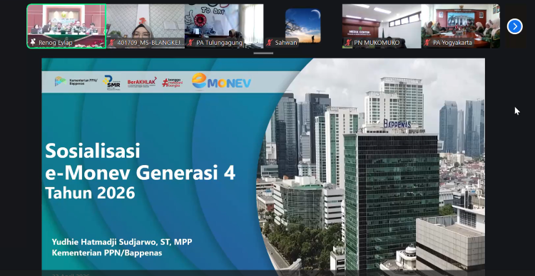 Blangkejeren – Mahkamah Syar’iyah Blangkejeren terus beradaptasi dengan perkembangan sistem pelaporan berbasis digital. Hal ini ditunjukkan dengan keikutsertaan pegawai dalam kegiatan Sosialisasi Aplikasi e-Monev Bappenas Generasi 4 Tahun 2026 yang dilaksanakan secara daring melalui Zoom Meeting pada Kamis, 23 April 2026.