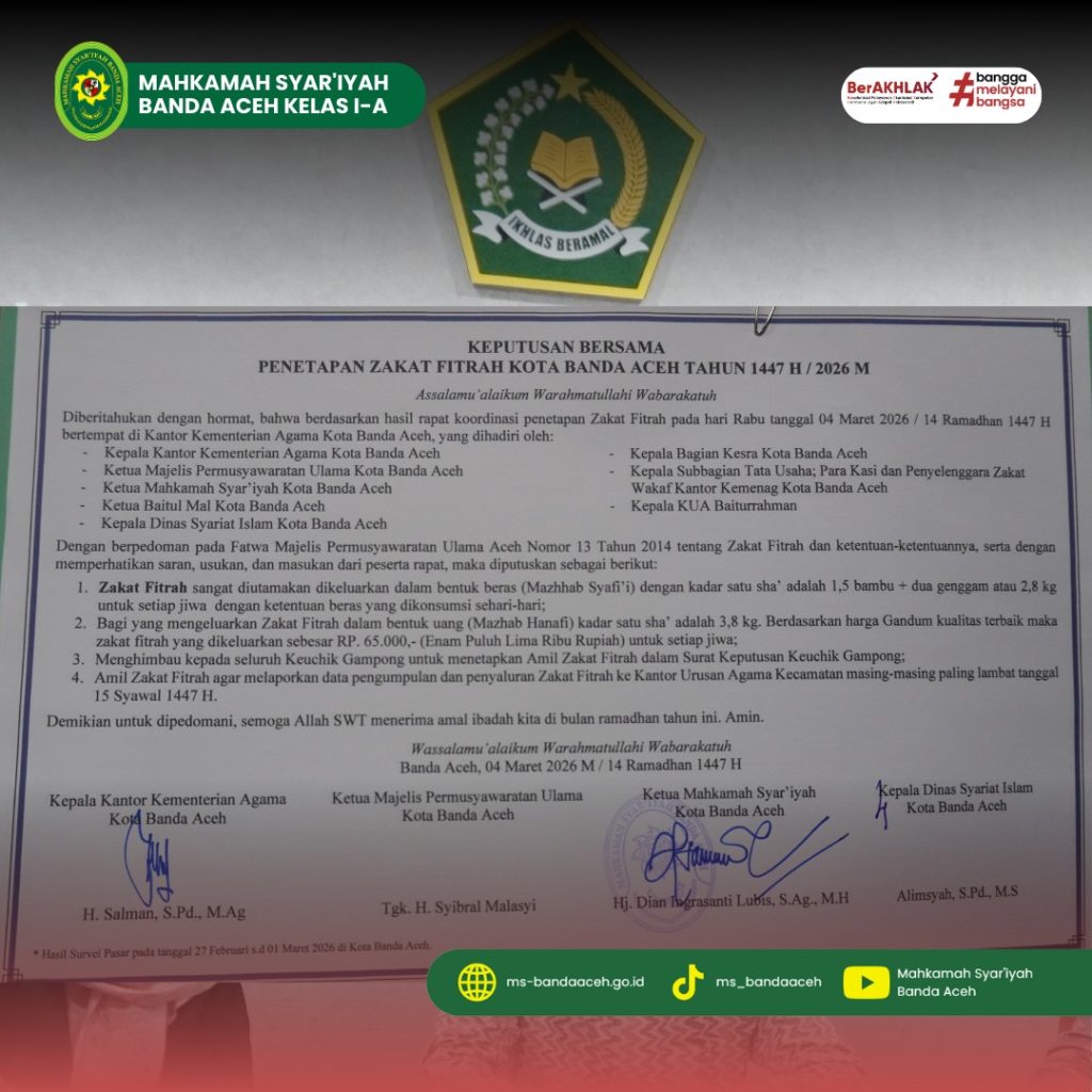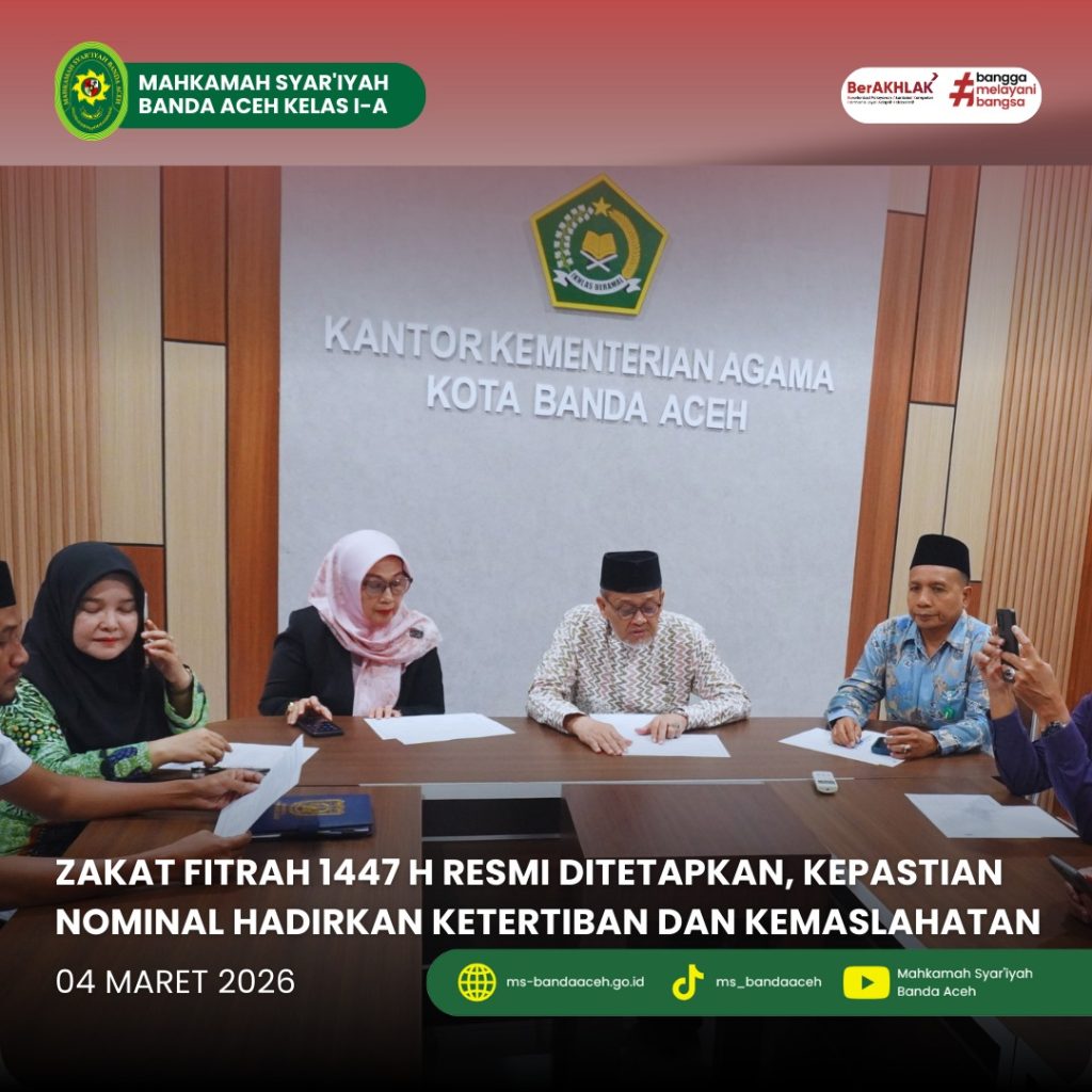Banda Aceh, 04 Maret 2026 – Menjelang Idulfitri 1447 H, masyarakat Kota Banda Aceh kini memiliki kepastian resmi terkait besaran zakat fitrah tahun 2026 M. Penetapan ini menjadi rujukan penting agar pelaksanaan ibadah berjalan seragam, tertib, dan memberikan dampak nyata bagi para mustahik di seluruh wilayah kota. Rapat penetapan diselenggarakan oleh Kementerian Agama Kota Banda Aceh dan dihadiri oleh berbagai pimpinan instansi, termasuk Ketua Mahkamah Syar’iyah Banda Aceh. Musyawarah dilakukan secara komprehensif dengan mempertimbangkan aspek fiqh, kondisi harga bahan pokok, serta kemaslahatan umat, sehingga keputusan yang dihasilkan memiliki dasar syar’i dan sosial yang kuat.